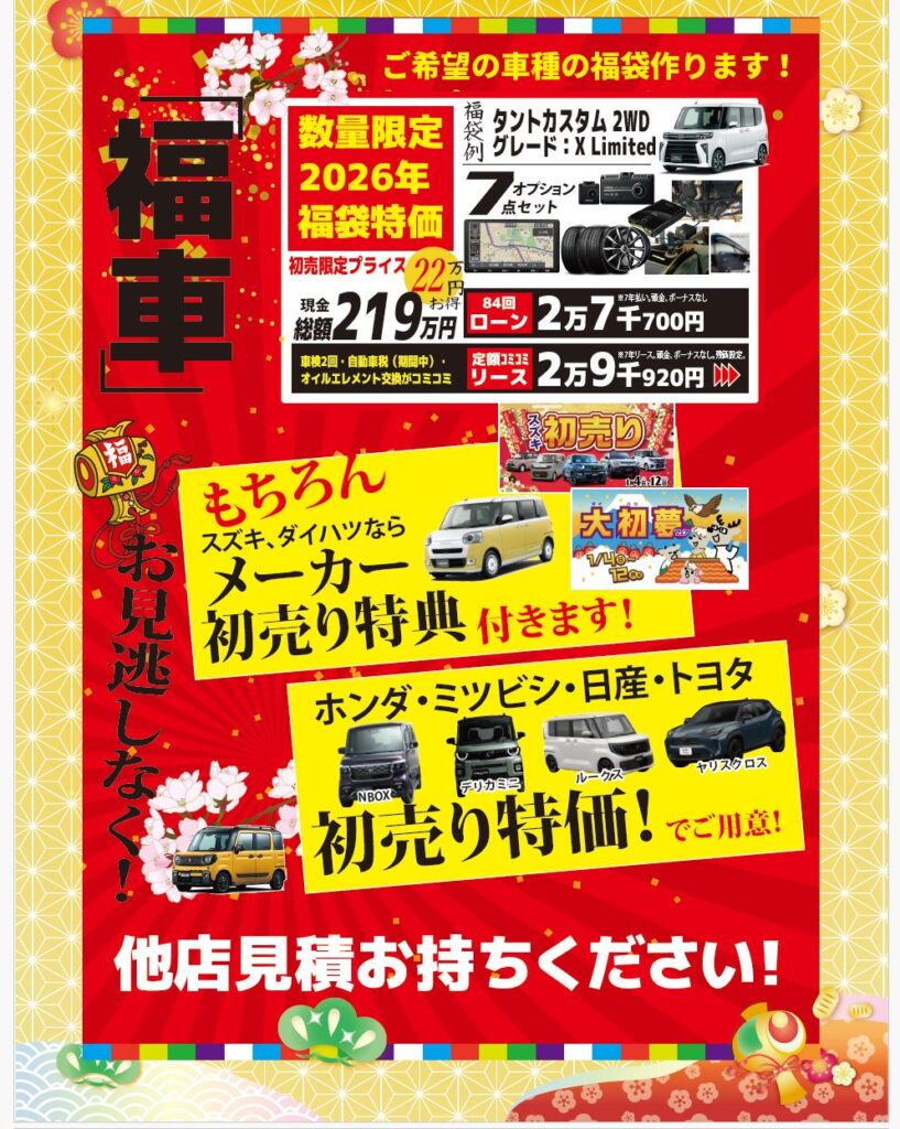 毎年恒例の福車!スズキ車ダイハツ車は各メーカーの特典もお使いいただけます。メーカー特典は12日まで適応可能です。