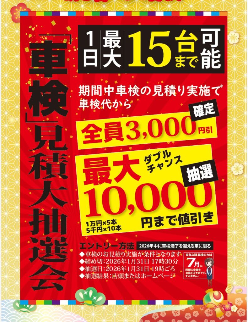 イベント内容:初売り期間(1月31日17時30分まで)に車検の見積りをした方全員に車検代最大10,000円割引が当たる抽選会