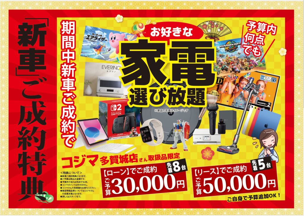 期間中新車をローンまたはリースでご成約頂いた方に コジマ多賀城店さん取扱い商品の中からお好きな商品を何点でもお選び頂けるご成約特典をお付けします!