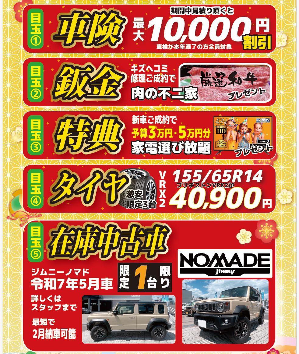 イベント内容:初売り期間(1月31日17時30分まで)に車検の見積りをした方全員に車検代最大10,000円割引が当たる抽選会